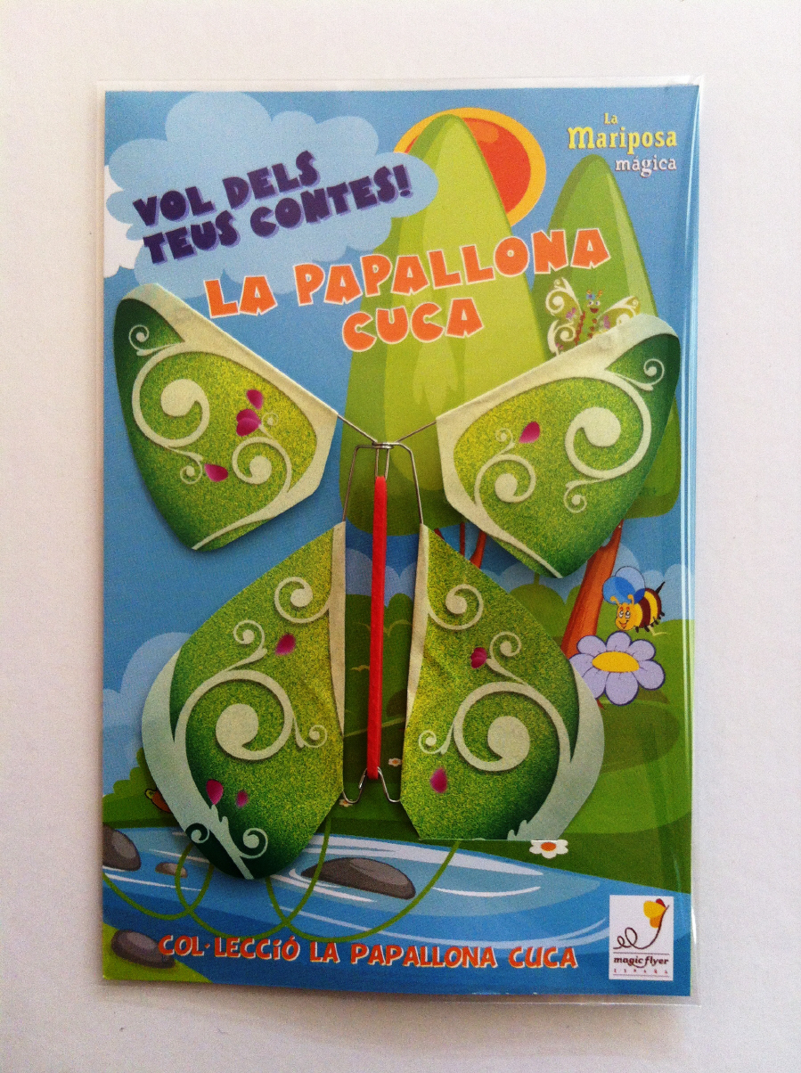 Mariposa Mágica Cuca verda en pack individual (en catalán) de celofan ideal para los niños forma parte de la colección "la Mariposa Cuca" y de la colección de Magiccuento Cuca la Oruga.